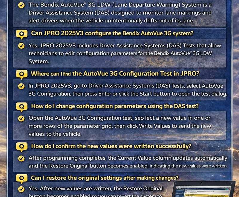 Yes. JPRO 2025V3 includes Driver Assistance Systems (DAS) Tests that allow technicians to edit configuration parameters for the Bendix AutoVue® 3G LDW System.