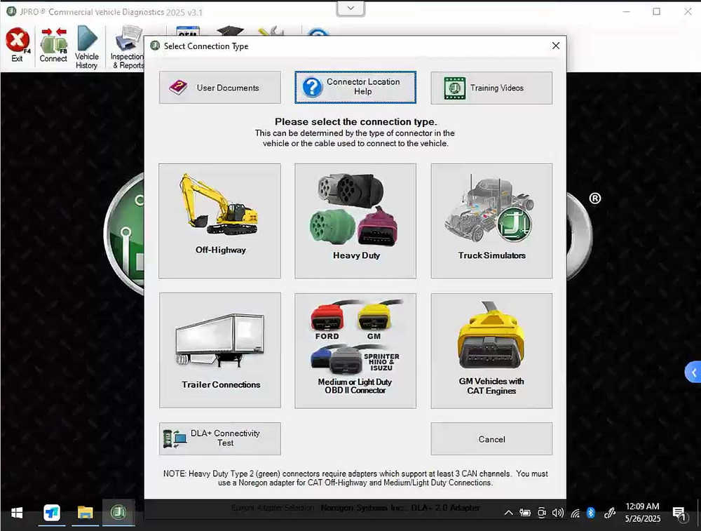 JPRO requires the use of a Noregon adapter. This includes DLA+, DLA+ Wireless, Trailer Diagnostic Adapter, and the Allison Transmission USB Translator.